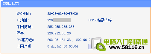 注意:如果路由器DHCP服务器是处于关闭状态,需要在电脑手动配置IP地址,请填写正确的网关(管理IP地址)、DNS服务器地址(在路由管理界面 运行状态 >> WAN状态 中查看DNS地址)。 (电脑入门到精通网 www.58116.cn)