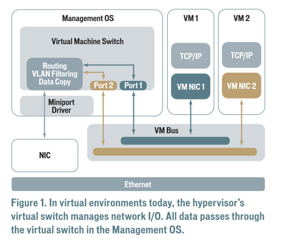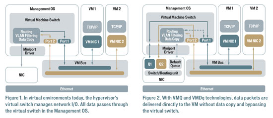 Hyper-V 2.0,也就是Windows Server 2008 R2携带的版本,提供了一个新的VMQ特性,它利用硬件的VMDq将虚拟交换机的大部分工作放到了网卡上,并通过内存映射设计避免了数据需要在多个空间来来回复制移动